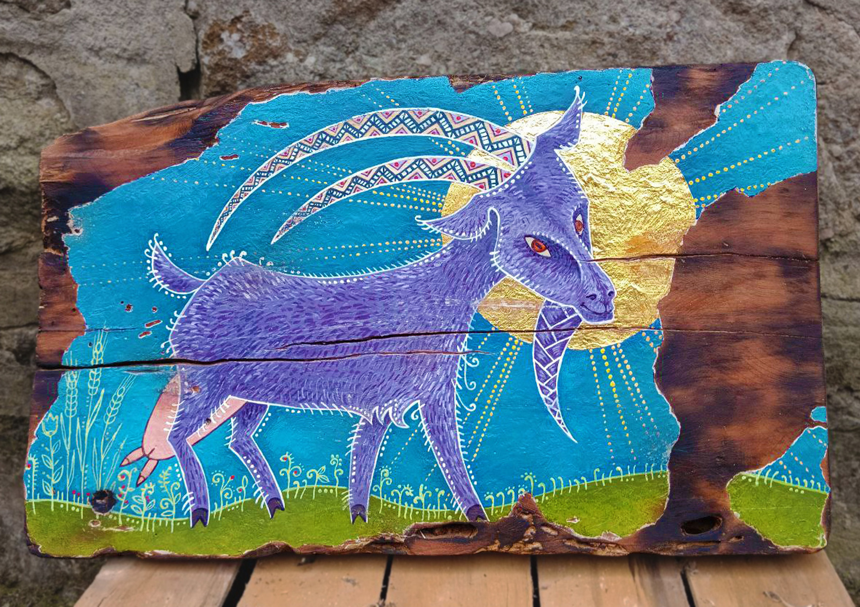 акрил, поталь, доска, огонь.